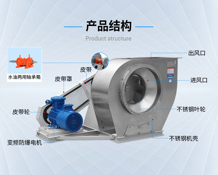 不銹鋼離心風機:主要由不銹鋼材質制成,具有抗腐蝕、耐高溫、美觀易清潔等特點。不銹鋼離心風機適用于一些對材質要求高、要求抗腐蝕性能好的場合。