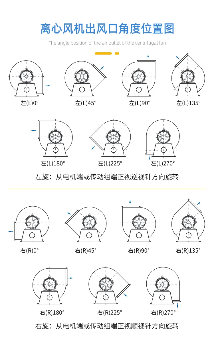 左右,指的是葉輪的旋轉(zhuǎn)方向;幾度,指的是風(fēng)機(jī)出口的位置。