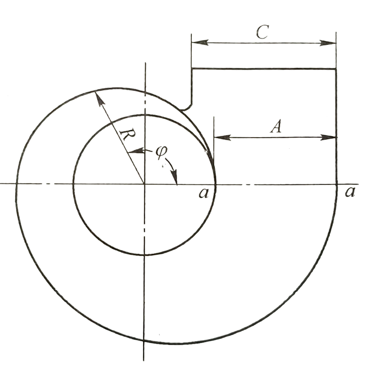 在Fk不變的情況下,從磨損和損失方面考慮,B小、A大要比B大、A小好些。這是因?yàn)锽小,氣體離開葉輪后通道面積突然擴(kuò)大程度(B/b2) 小些,相應(yīng)損失要小些;而A大時(shí),蝸殼螺旋半徑Rφ大,螺旋平面通道大,葉輪拋出的顆粒質(zhì)點(diǎn)對內(nèi)壁的撞擊減少,故蝸殼內(nèi)壁的磨損要小些。