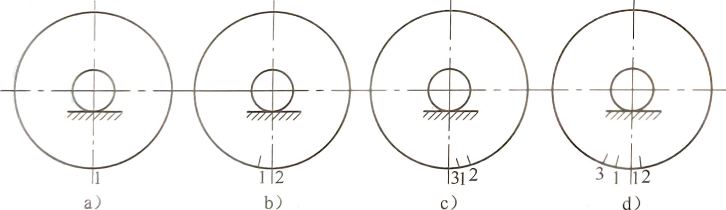 將離心通風(fēng)機轉(zhuǎn)子輕放在平衡機的軌道上(或圓盤夾角內(nèi)),使轉(zhuǎn)子水平軸線垂直于軌道軸線。用手扳動轉(zhuǎn)子,使其任意停止。在轉(zhuǎn)子下面作一標(biāo)記“1”,如圖a。為了消除摩擦阻力矩誤差,將轉(zhuǎn)子旋轉(zhuǎn)90°使標(biāo)記“1”與轉(zhuǎn)子中心線成水平位置,然后放開,待停止擺動后,在此刻轉(zhuǎn)子的最下面作標(biāo)記“2”,如圖b。再將轉(zhuǎn)子向相反方向轉(zhuǎn)90,同樣使標(biāo)記“1”與轉(zhuǎn)子中心線成水平位置,放開,待擺動停止后,在此刻離心通風(fēng)機轉(zhuǎn)子的最下面作標(biāo)記“3”,如圖c。如果標(biāo)記“1”、“2”、“3”點相重合,則偏重位置就在重合點處,否則,偏重位置就在標(biāo)記“2”與“3”的中間,如圖d。