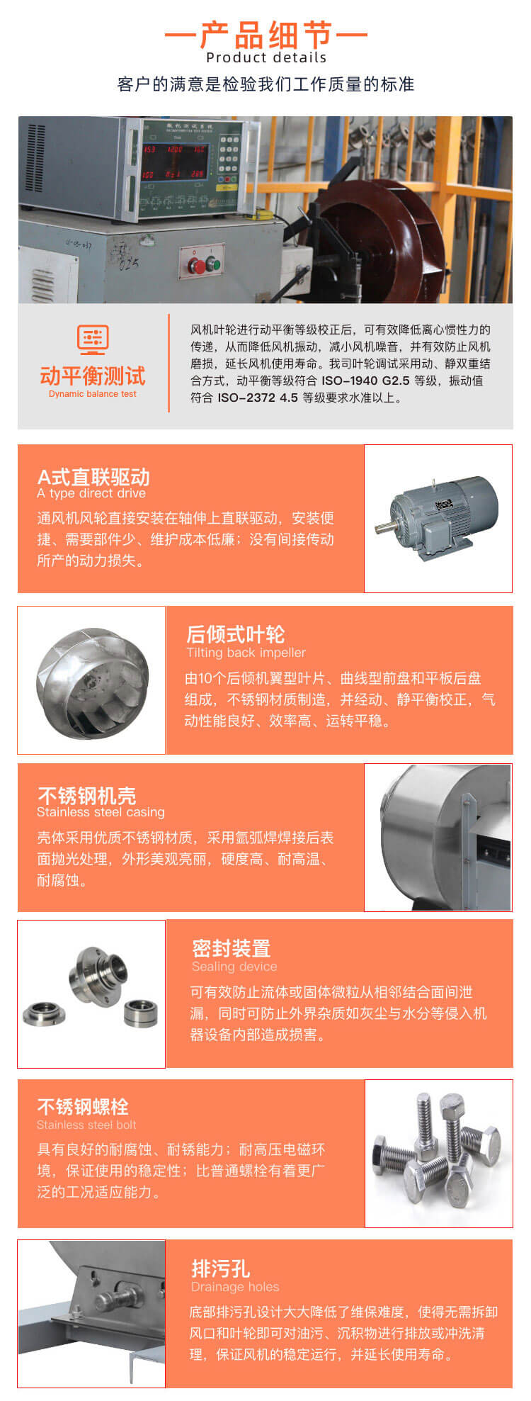 風機主要由電機、蝸殼、葉輪、進風口、電機支撐結構等組成。從電動機 端正視,葉輪順時針旋轉稱為右旋風機,以“ 右”表示;葉輪逆時針旋轉稱為左 旋風機,以“左”表示。風機的出口位置以機殼的出風口角度表示。