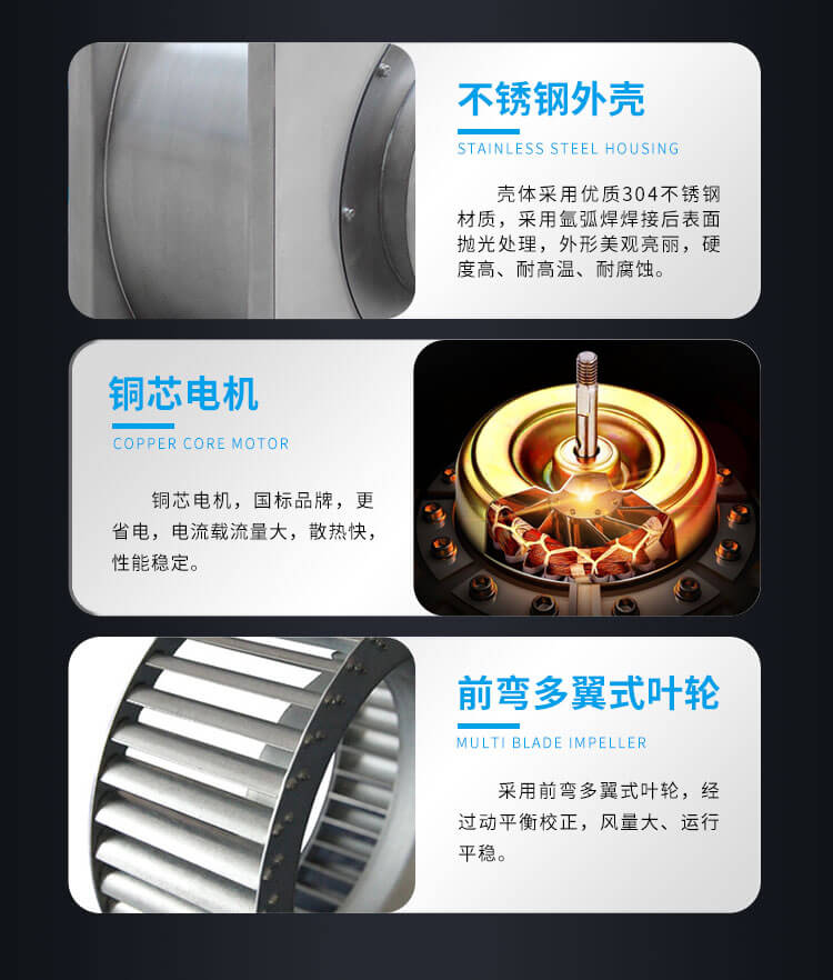 靜壓高、風(fēng)量大,結(jié)構(gòu)先進(jìn)、合理,良好的氣動(dòng)性能,適用于復(fù)雜的管網(wǎng)環(huán)境,是油煙的克星。