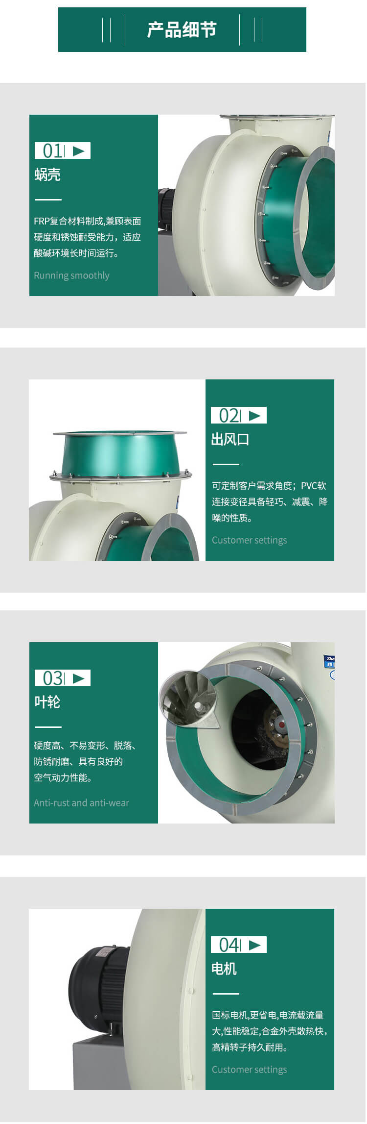 玻璃鋼材質(zhì)制成,耐腐蝕性好、不易老化、噪聲低、效率高、重量輕。