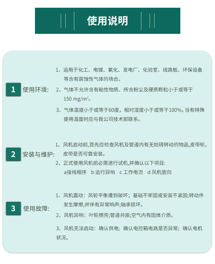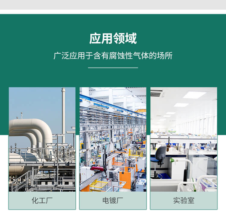 適用于化工廠、紡織、電鍍、實(shí)驗(yàn)室等場所排送含有一定濃度的酸、堿、鹽等腐蝕性氣體,也可以作為一般工廠的建筑物通風(fēng)換氣用