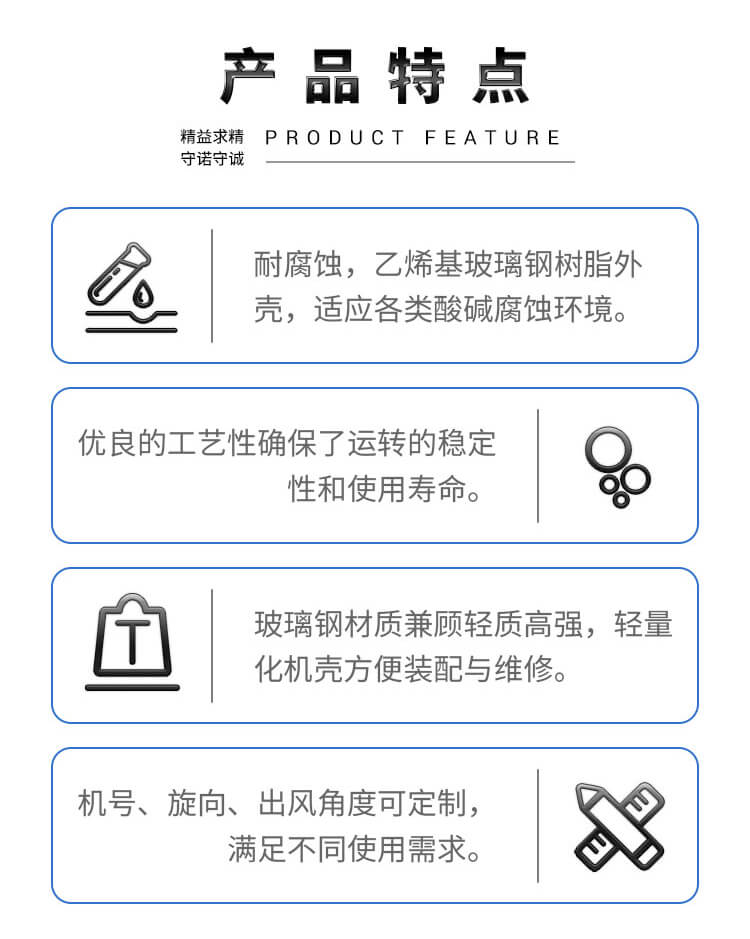 適用于化工、紡織、電鍍、實驗室等場所排送含有一定濃度的酸、堿、鹽等腐蝕性氣體,也可以作為一般工廠的建筑物通風換氣用