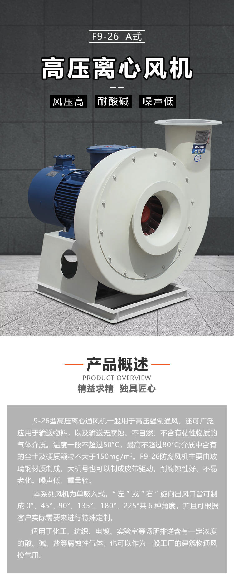 9- 26型高壓離心通風機-般用于高壓強制通風,還可廣泛應用于輸送物料,以及輸送無腐蝕、不自燃、不含有黏性物質(zhì)的氣體介質(zhì)。溫度一般不超過50°C, 最高不超過80°C;介質(zhì)中含有的塵土及硬質(zhì)顆粒不大于150mg/m3。F9-26防腐風機主要由玻璃鋼材質(zhì)制成,大機號也可以制成皮帶驅(qū)動,耐腐蝕性好、不易老化。噪聲低、重量輕。