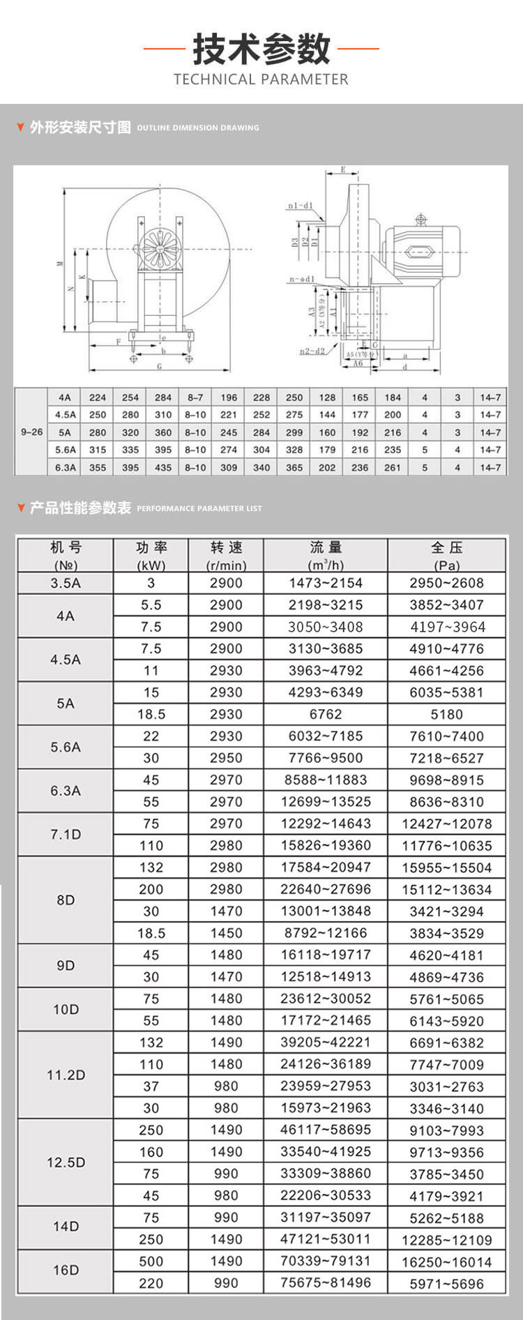 9- 26型高壓離心通風機-般用于高壓強制通風,還可廣泛 應用于輸送物料,以及輸送無腐蝕、不自燃、不含有黏性物質(zhì)的 氣體介質(zhì)。