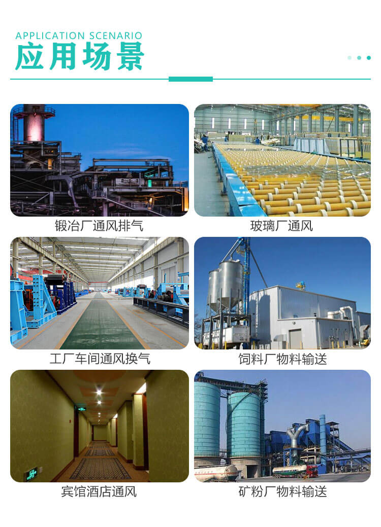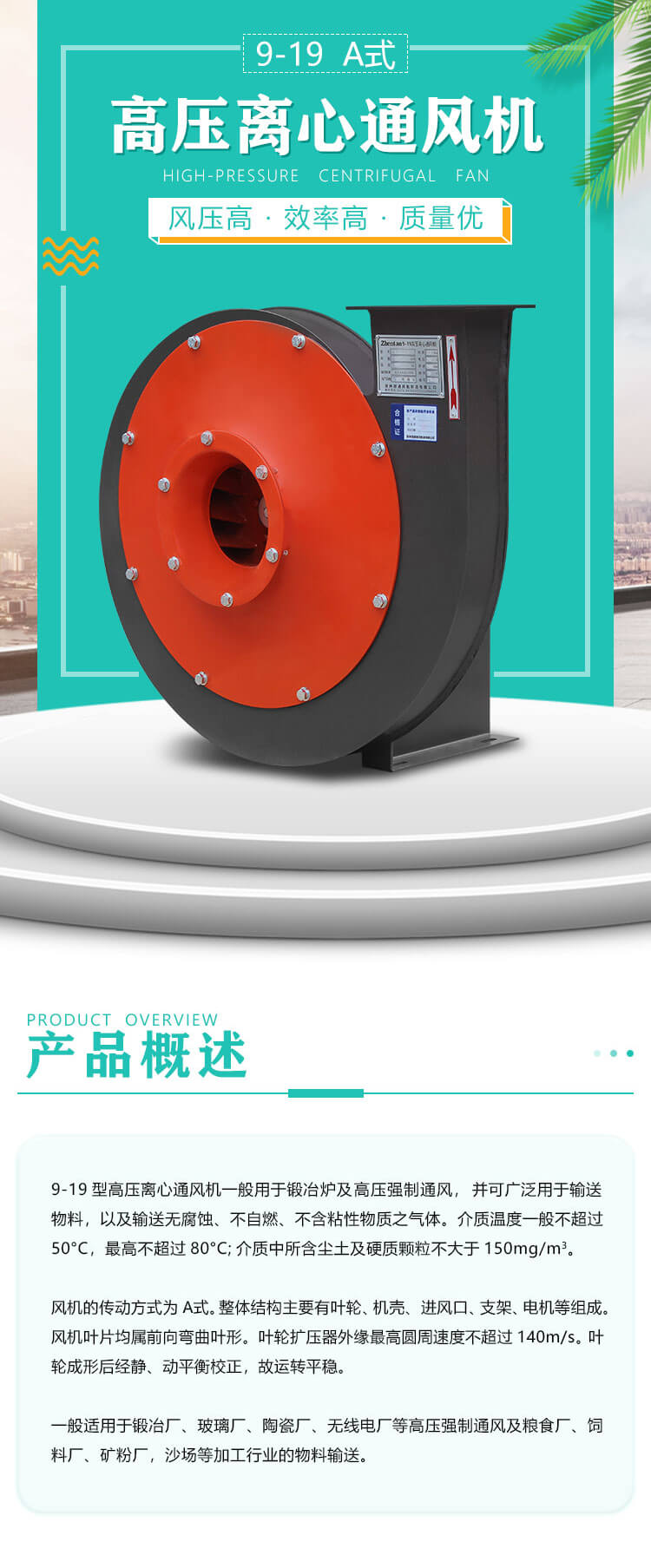 9-19型高壓離心通風(fēng)機(jī)一般用于鍛冶爐及高壓強(qiáng)制通風(fēng),并可廣泛用于輸送物料,以及輸送無腐蝕、不自燃、不含黏性物質(zhì)之氣體。介質(zhì)溫度一般不超過50℃,最高不超過80℃。