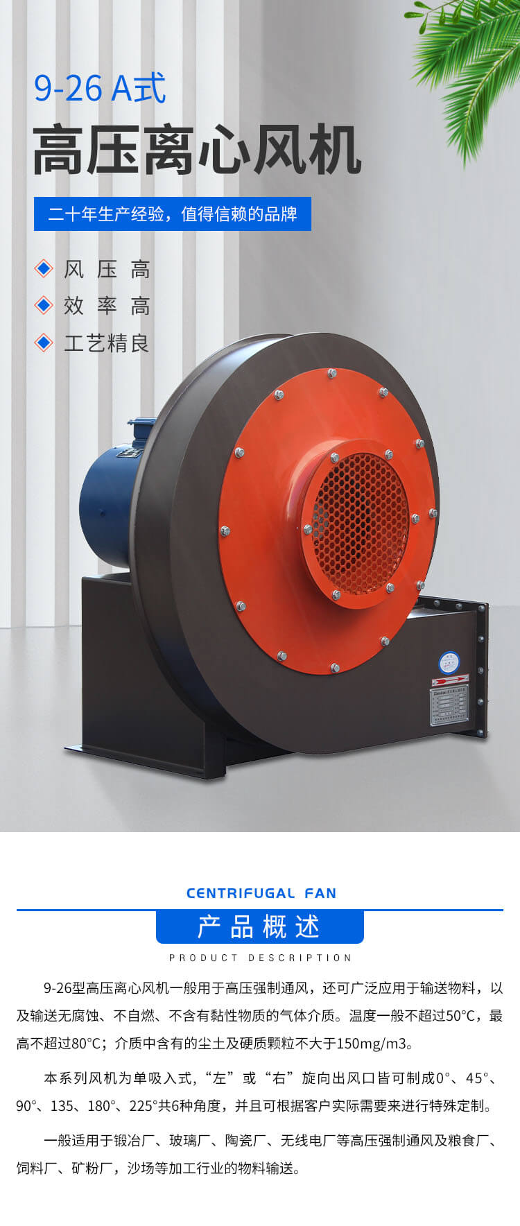 9-26系列離心式通風(fēng)機,具有風(fēng)壓高,效率高,效率區(qū)寬,結(jié)構(gòu)緊湊,運行可靠等優(yōu)點。廣泛用于高壓強制通風(fēng),如鍛治爐等場合。