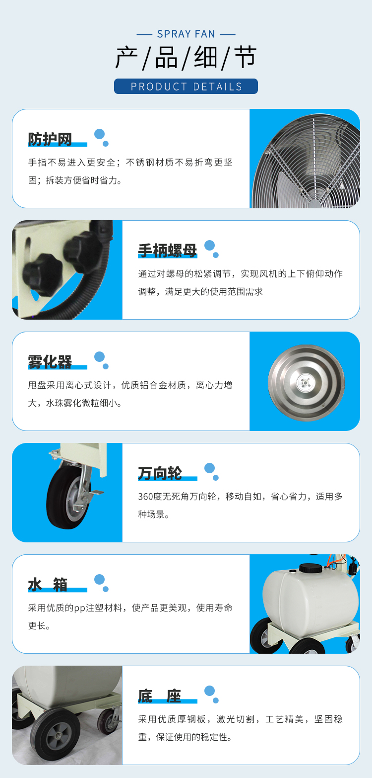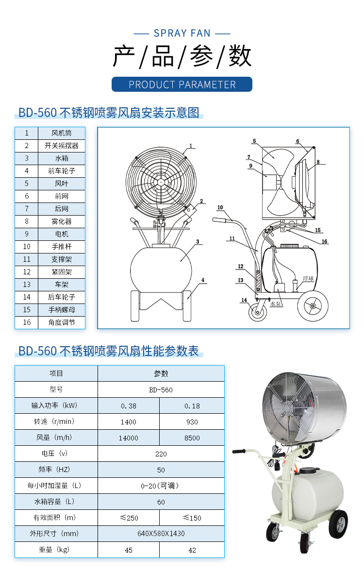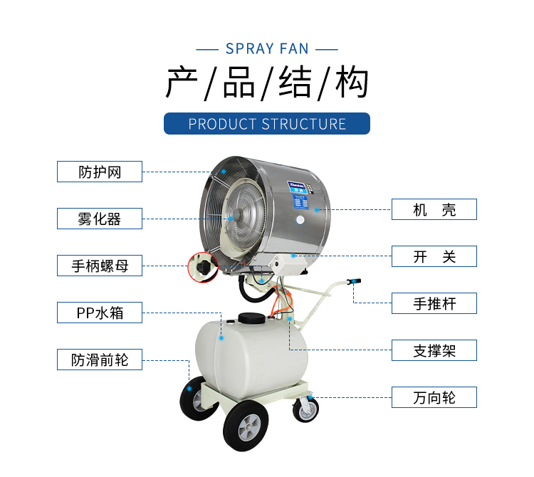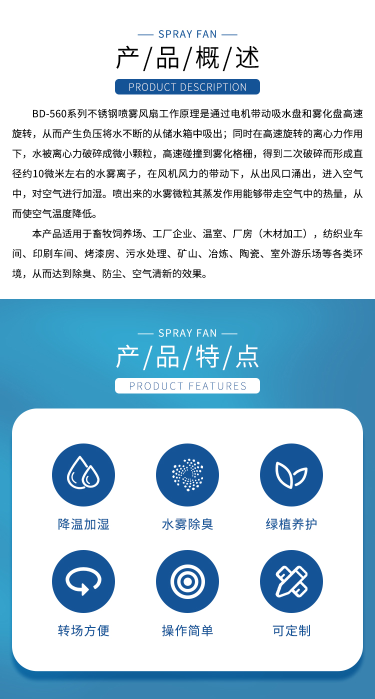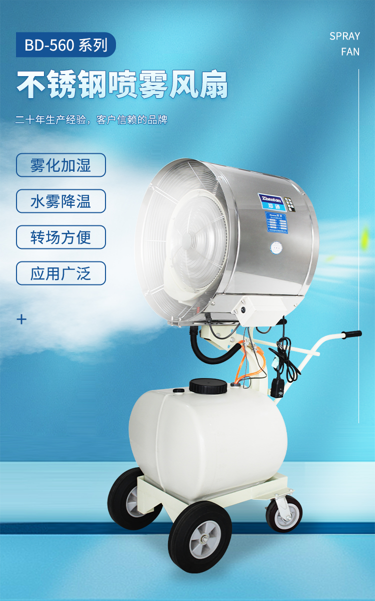 BD-560系列不銹鋼噴霧風(fēng)扇工作原理是通過電機帶動吸水盤和霧化盤高速旋轉(zhuǎn),從而產(chǎn)生負壓將水不斷的從儲水箱中吸出;同時在高速旋轉(zhuǎn)的離心力作用下,水被離心力破碎成微小顆粒,高速碰撞到霧化格柵,得到二次破碎而形成直徑約10微米左右的水霧離子,在風(fēng)機風(fēng)力的帶動下,從出風(fēng)口涌出,進入空氣中,對空氣進行加濕。噴出來的水霧微粒其蒸發(fā)作用能夠帶走空氣中的熱量,從而使空氣溫度降低。