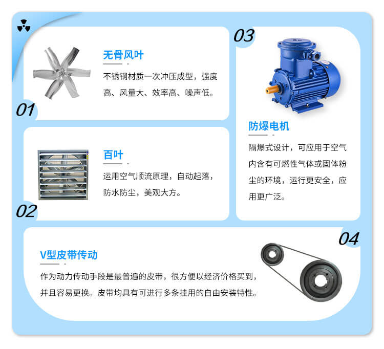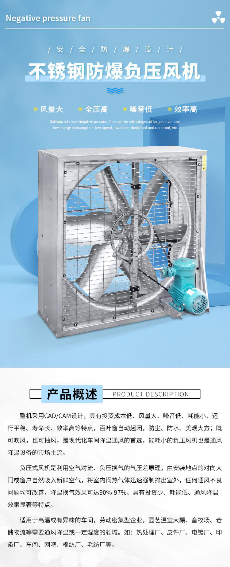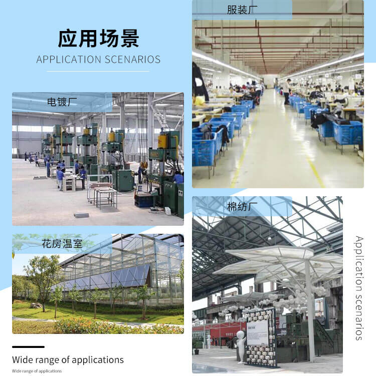 適用于高溫或有異味的車間,勞動(dòng)密集型企業(yè),園藝溫室大棚、畜牧場(chǎng)、倉儲(chǔ)物流等需要通風(fēng)降溫或一定濕度的領(lǐng)域,如熱處理廠、皮件廠、電鍍廠、印染廠、車間、網(wǎng)吧、棉紡廠、毛紡廠等。