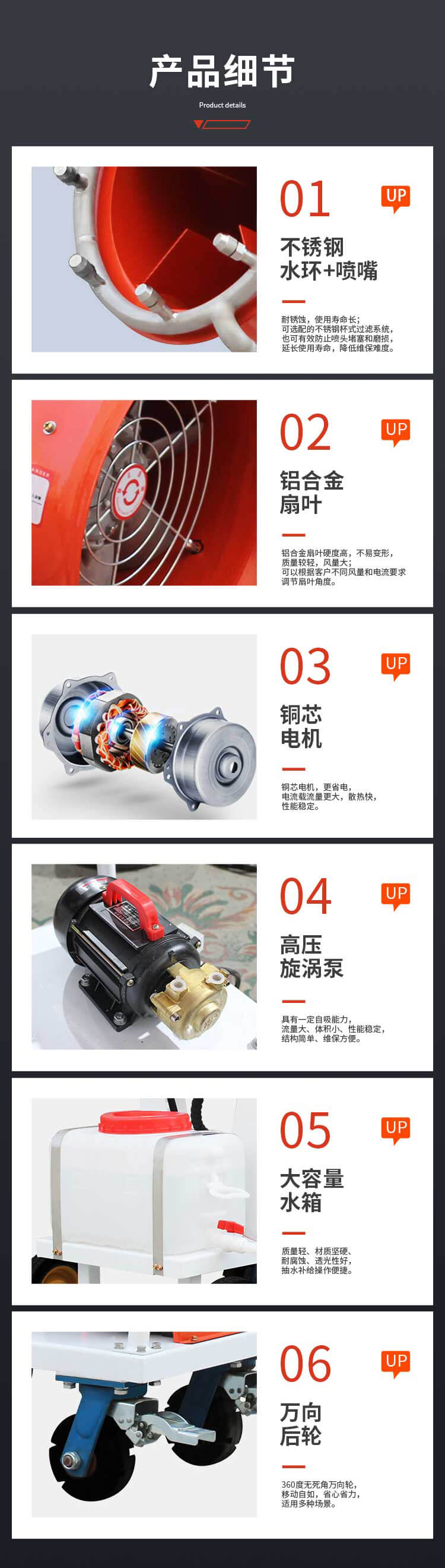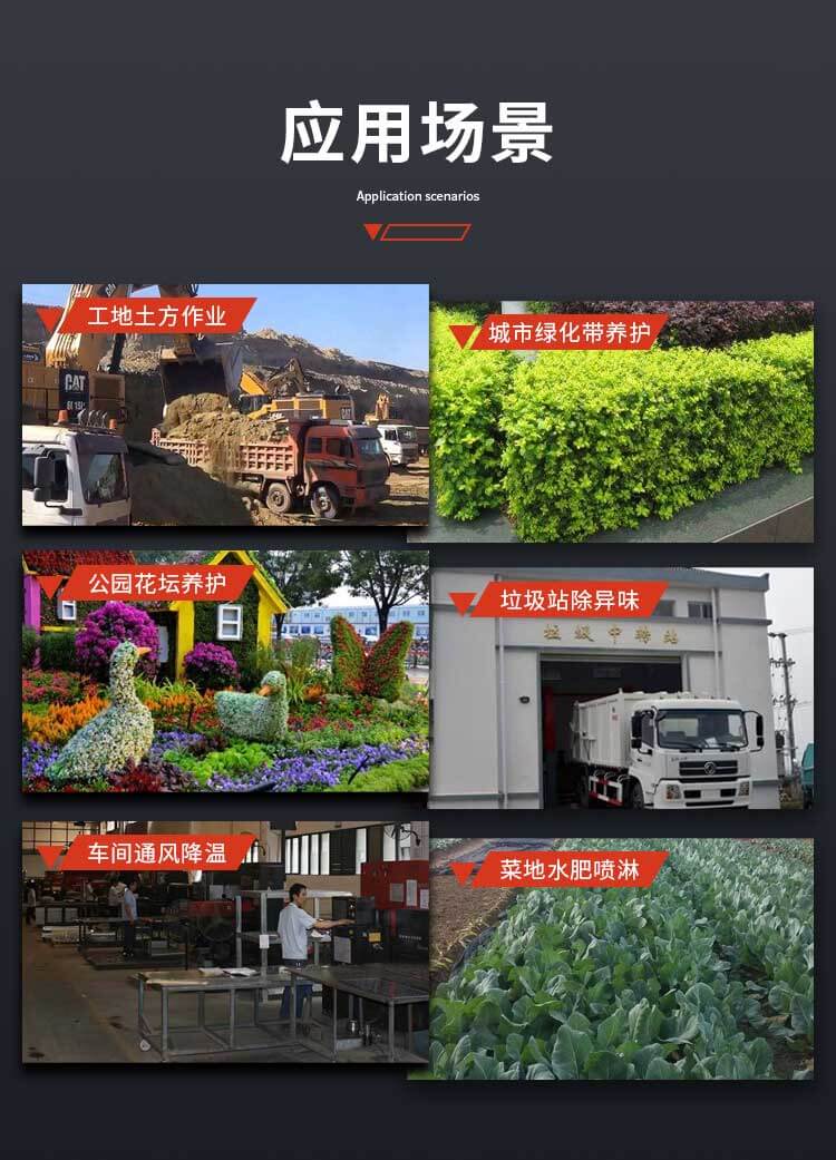 應(yīng)用于多種場(chǎng)合,如車(chē)間通風(fēng)降溫、植被養(yǎng)護(hù)澆水加濕、垃圾站除異味、植物作物水肥藥物噴淋等。