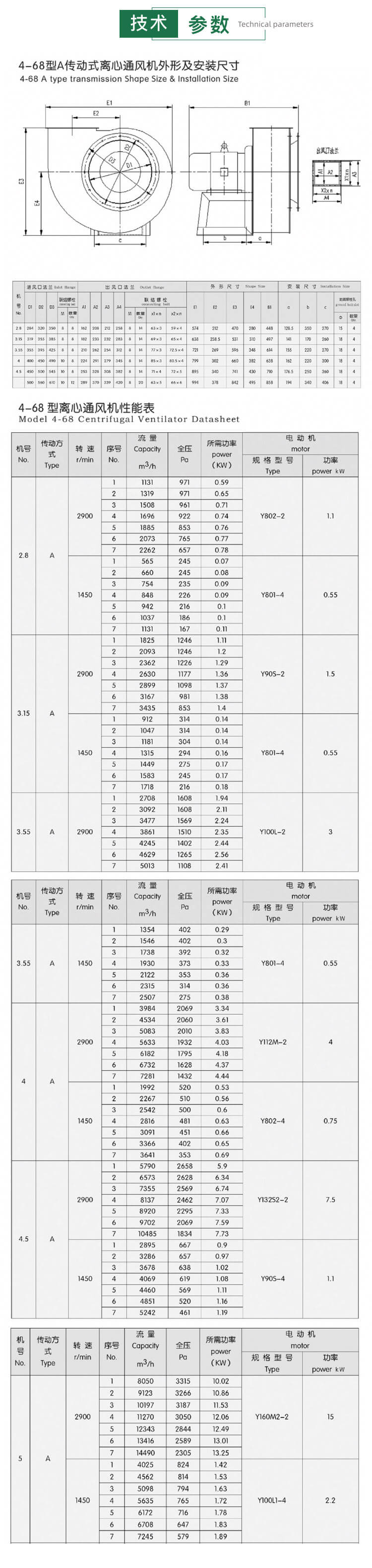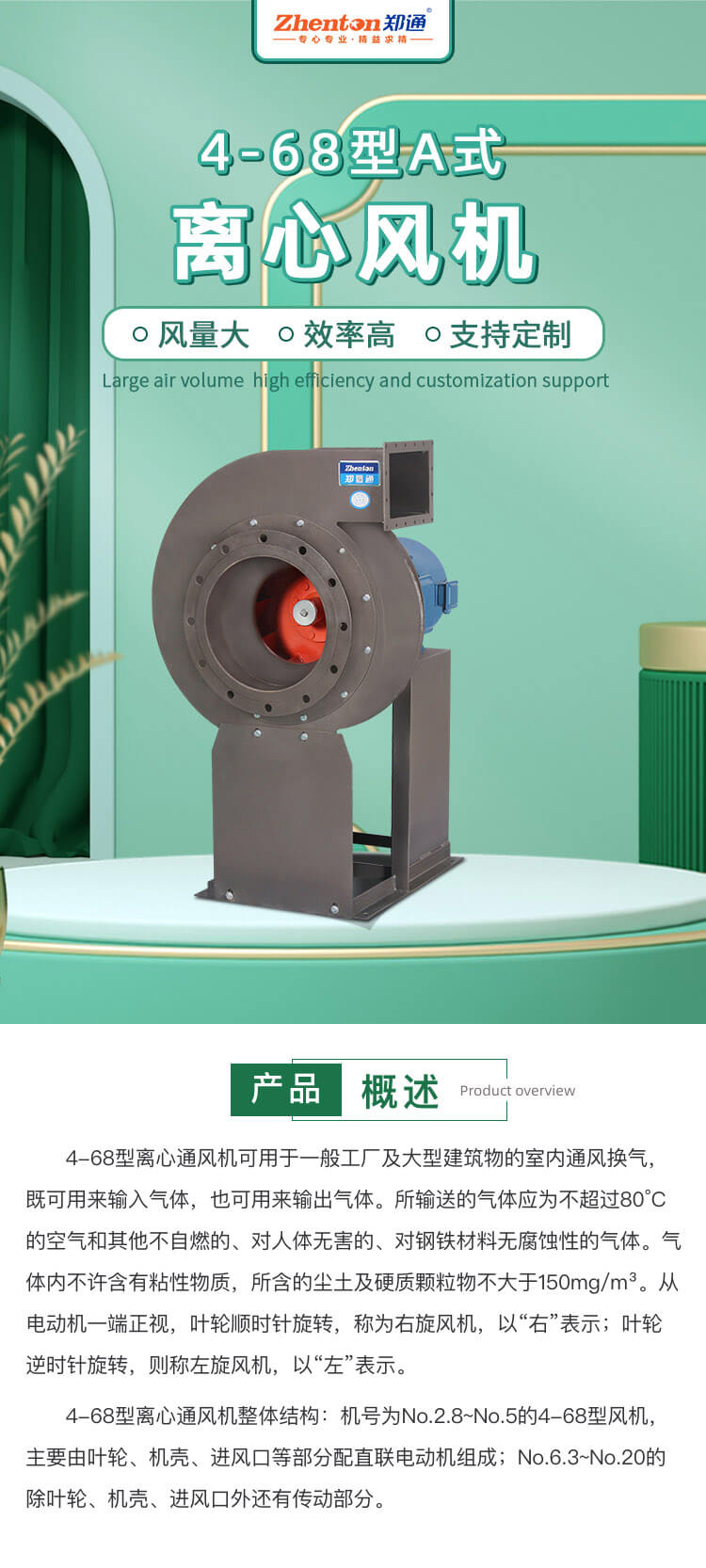 4-68型離心通風(fēng)機(jī)可用于一般工廠及大型建筑物的室內(nèi)通風(fēng)換氣,既可用來(lái)輸入氣體,也可用來(lái)輸出氣體。所輸送的氣體應(yīng)為不超過(guò)80°C的空氣和其他不自燃的、對(duì)人體無(wú)害的、對(duì)鋼鐵材料無(wú)腐蝕性的氣體。