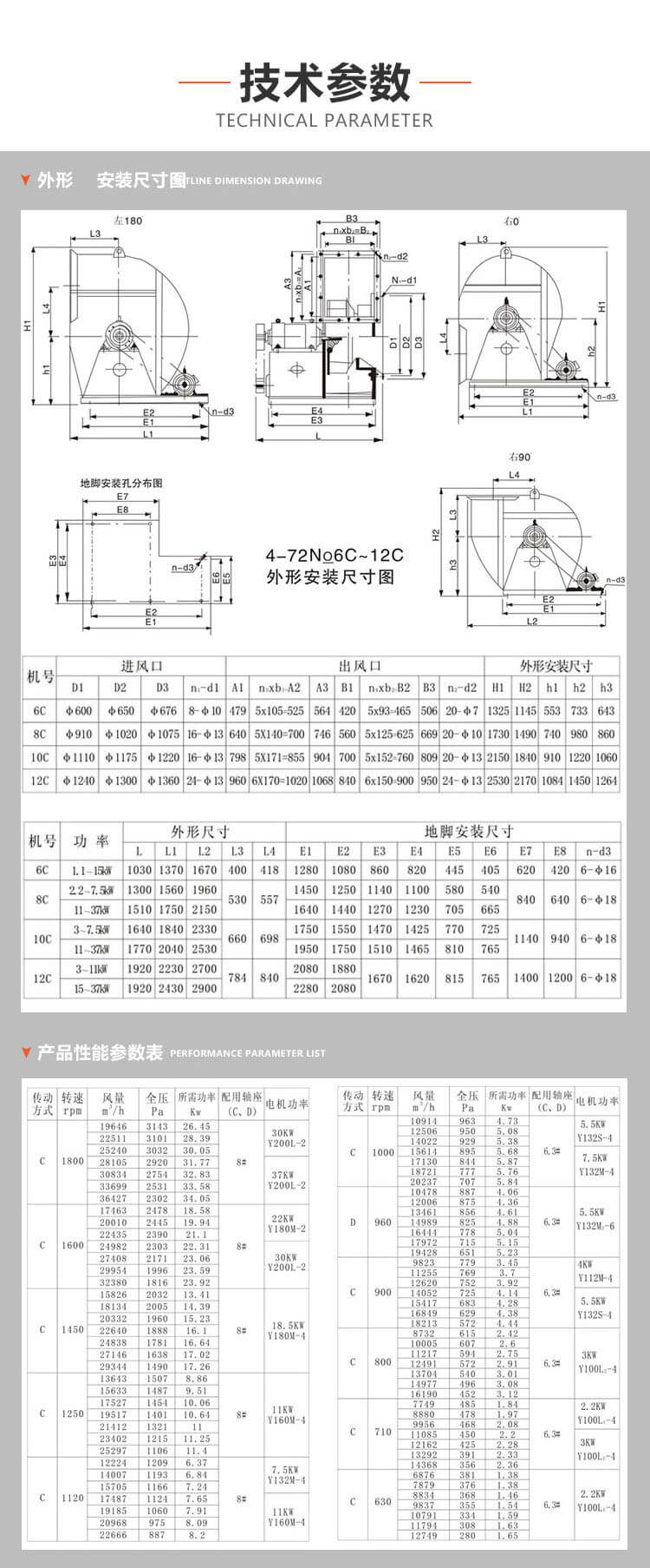 4-72型離心式通風(fēng)機(jī)可輸送空氣和其他不自燃的、對(duì)人體無(wú) 害的、對(duì)鋼材無(wú)腐蝕性的氣體。氣體內(nèi)不允許有粘性物質(zhì),所含 塵土及硬質(zhì)顆粒物不大于150mg/m3。氣體溫度不得超過(guò) 80°C。B4-72型防爆型離心式通風(fēng)機(jī)、主要有葉輪、機(jī)殼、進(jìn)風(fēng)口 等部分與防爆電機(jī)組成、可作為易燃揮發(fā)性氣體的通風(fēng)換氣使用、 其性能和安裝尺寸同于4-72型。