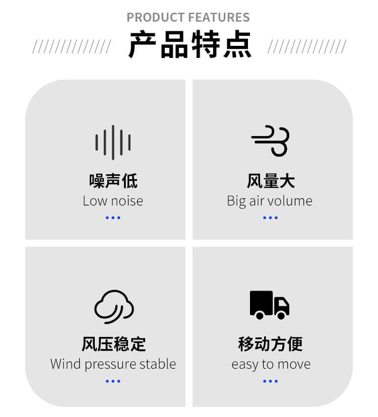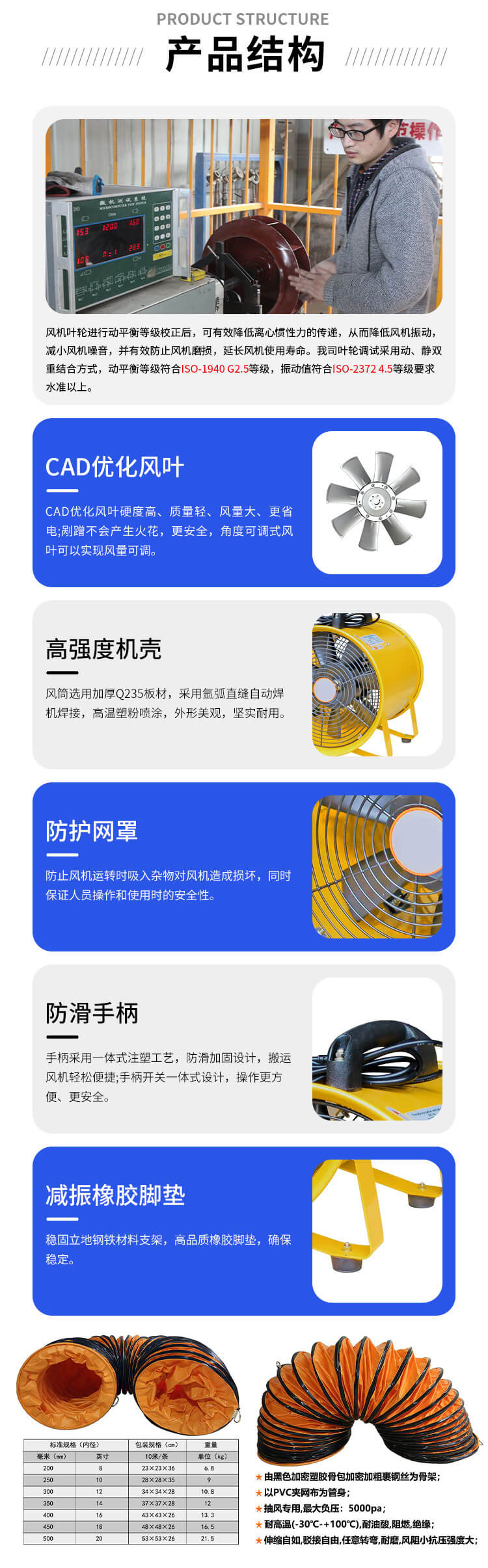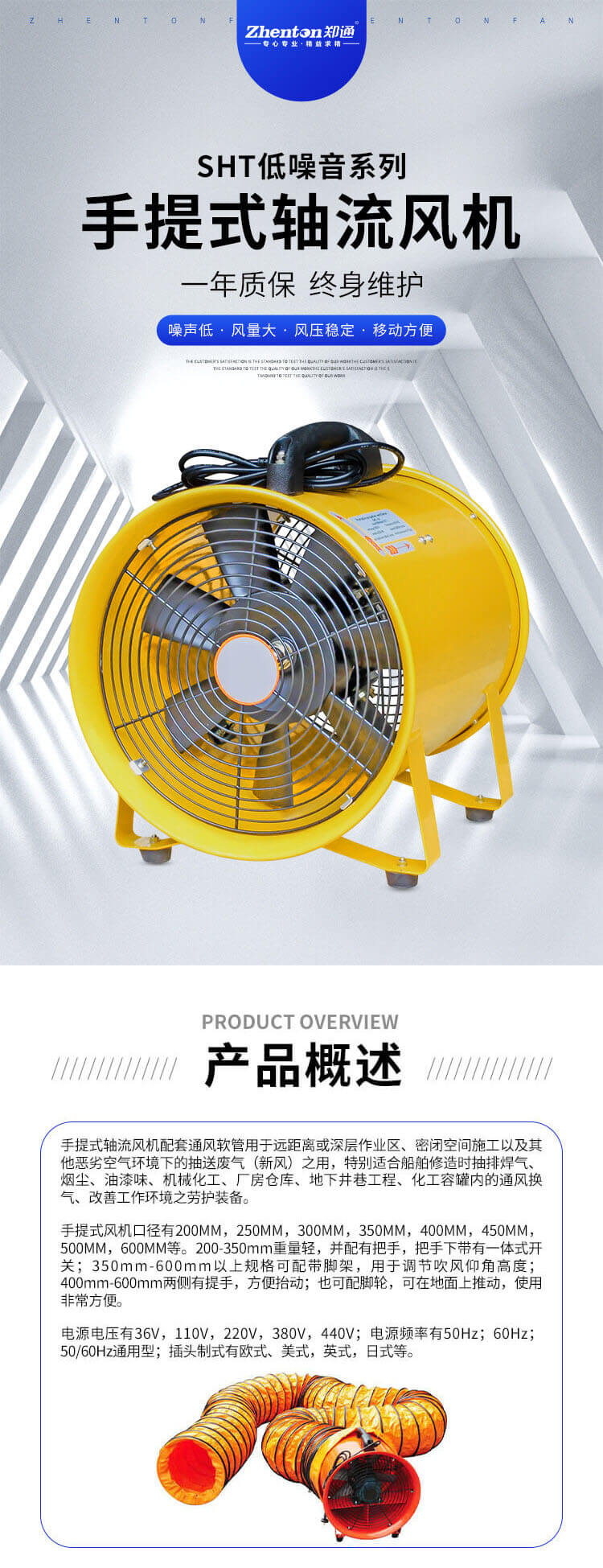 手提式風機口徑有200MM,250MM,300MM,350MM,400MM,450MM,50OMM,60OMM等。200-350mm重量輕,并配有把手,把手下帶有一體式開關;350mm-600mm以上規(guī)格可配帶腳架,用于調節(jié)吹風仰角高度;400mm-600mm兩側有提手,方便抬動;也可配腳輪,可在地面上推動,使用非常方便。