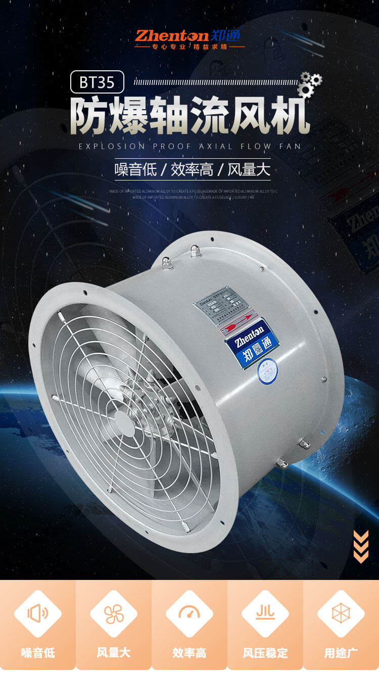 BT35系列防爆軸流通風機可用一般工廠、倉庫 、辦公室、住宅內通風換氣,或加強暖氣散熱之用,也可在管道內作為加壓使用,使用T35、BT35的介質應為無腐蝕性及顯著粉塵,其溫度不超過40℃。