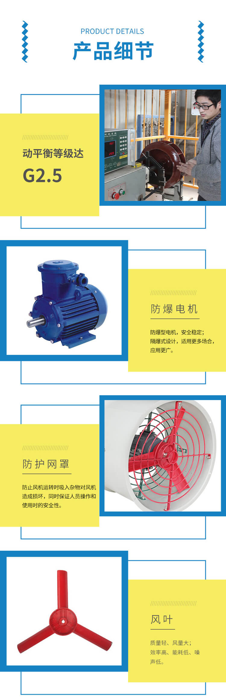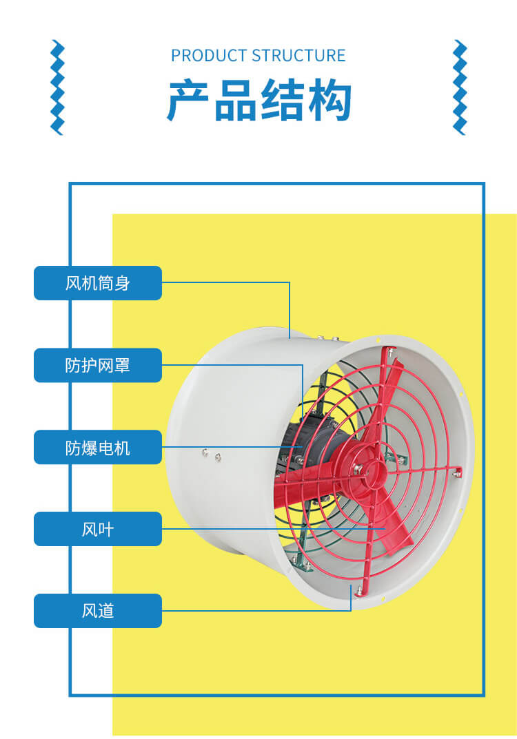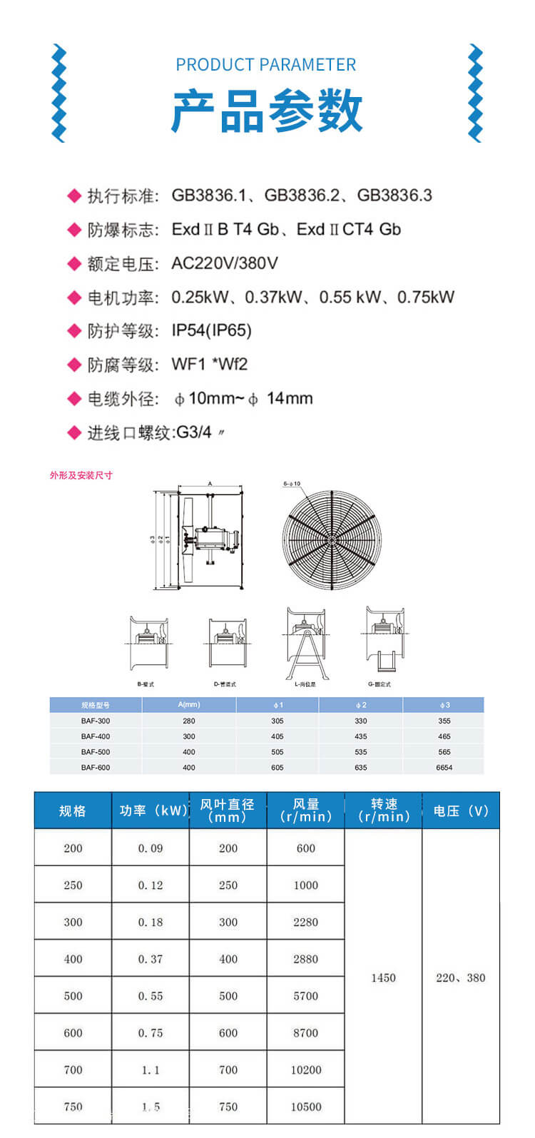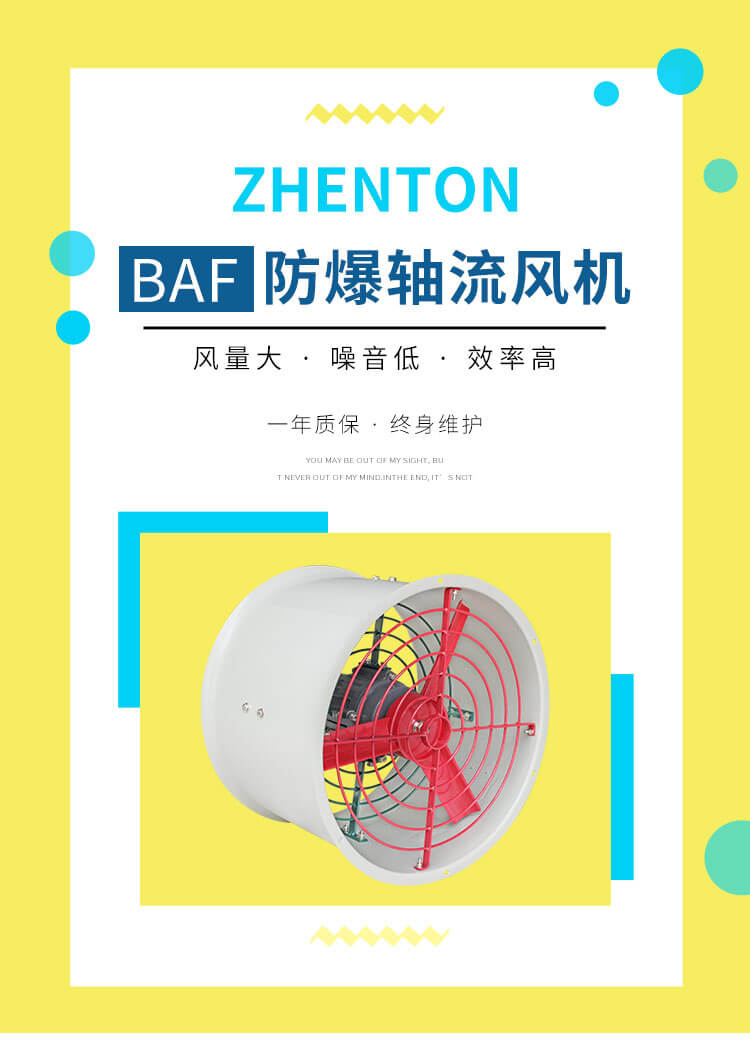 BAF防爆軸流風(fēng)機由防爆電機、風(fēng)葉、風(fēng)筒等部分組成,葉片由鋁板制成,風(fēng)筒用鋼板與型材加工焊接而成,電源引線用鋼管布線和電纜布線均可,殼外設(shè)有接地螺釘